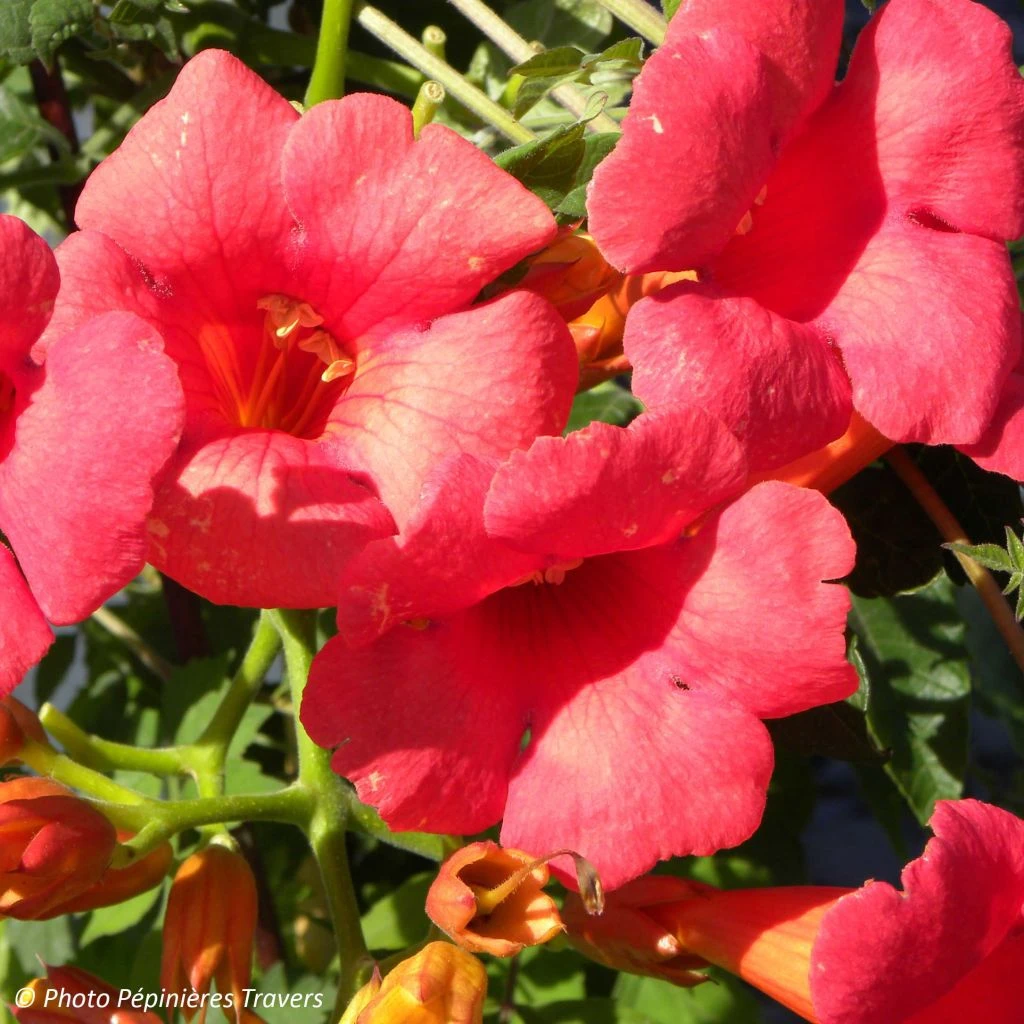 Habituellement de couleur rouge orangĂ©, les fleurs de Bignone exhibent chez les nouveaux cultivars des teintes orange saumonĂ© âIndian Summerâ, ou rouge vif âStromboliâ du plus bel effet dans un jardin.