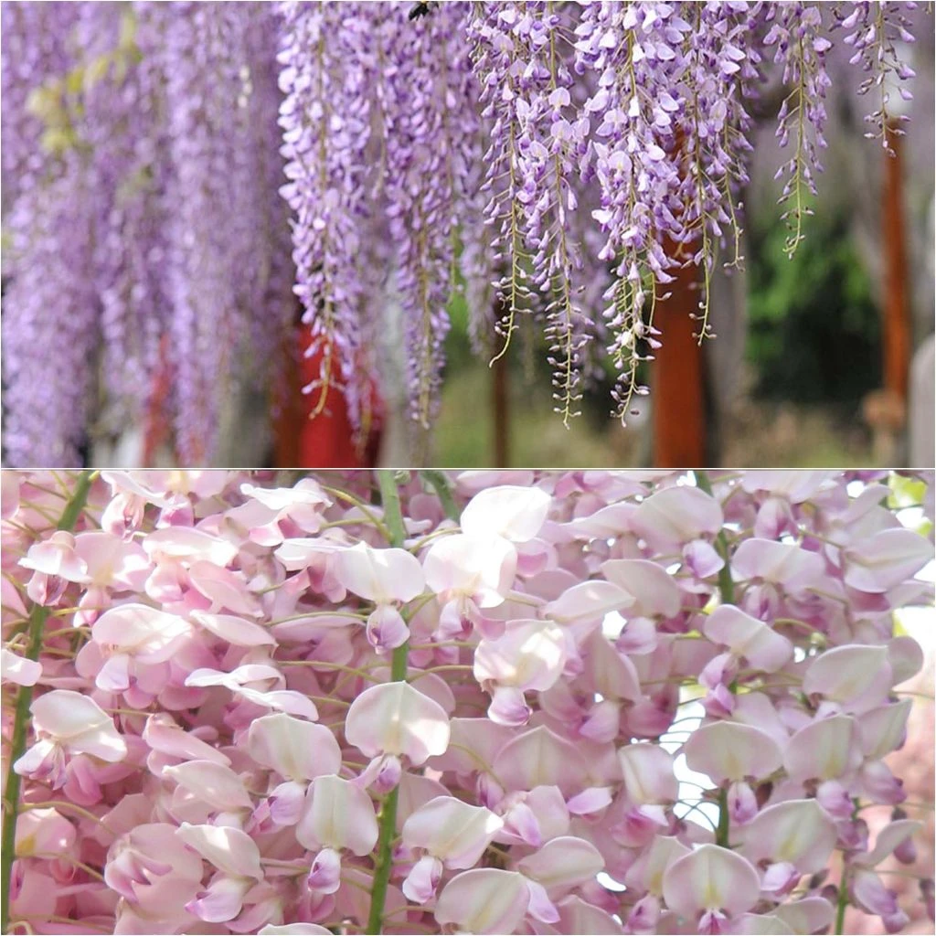 Un merveilleux duo de Glycines du Japon, si bien nommĂ©es glycines gracieuses. Il rĂ©unit deux jolies formes de la Wisteria venusta, moins imposante que sa cousine la Glycine de Chine :  la première Ă fleurs rose pâle, et l’autre Ă fleurs d’un mauve-bleutĂ©. Leurs grappes plus courtes, aux tons pastel parfaitement assortis, se mĂŞlent dans un lĂ©ger parfum fleuri, au printemps sur des rameaux Ă peine feuillĂ©s, puis parfois Ă nouveau en fin d’Ă©tĂ©, noyĂ©es dans le feuillage. Les glycines enroulent spontanĂ©ment et avec voluptĂ© leurs longues tiges volubiles autour des grilles, grillages, tonnelles et pergola. Celles-ci, mieux adaptĂ©es aux petits jardins, peuvent Ă©galement s’installer dans un grand bac sur la terrasse.