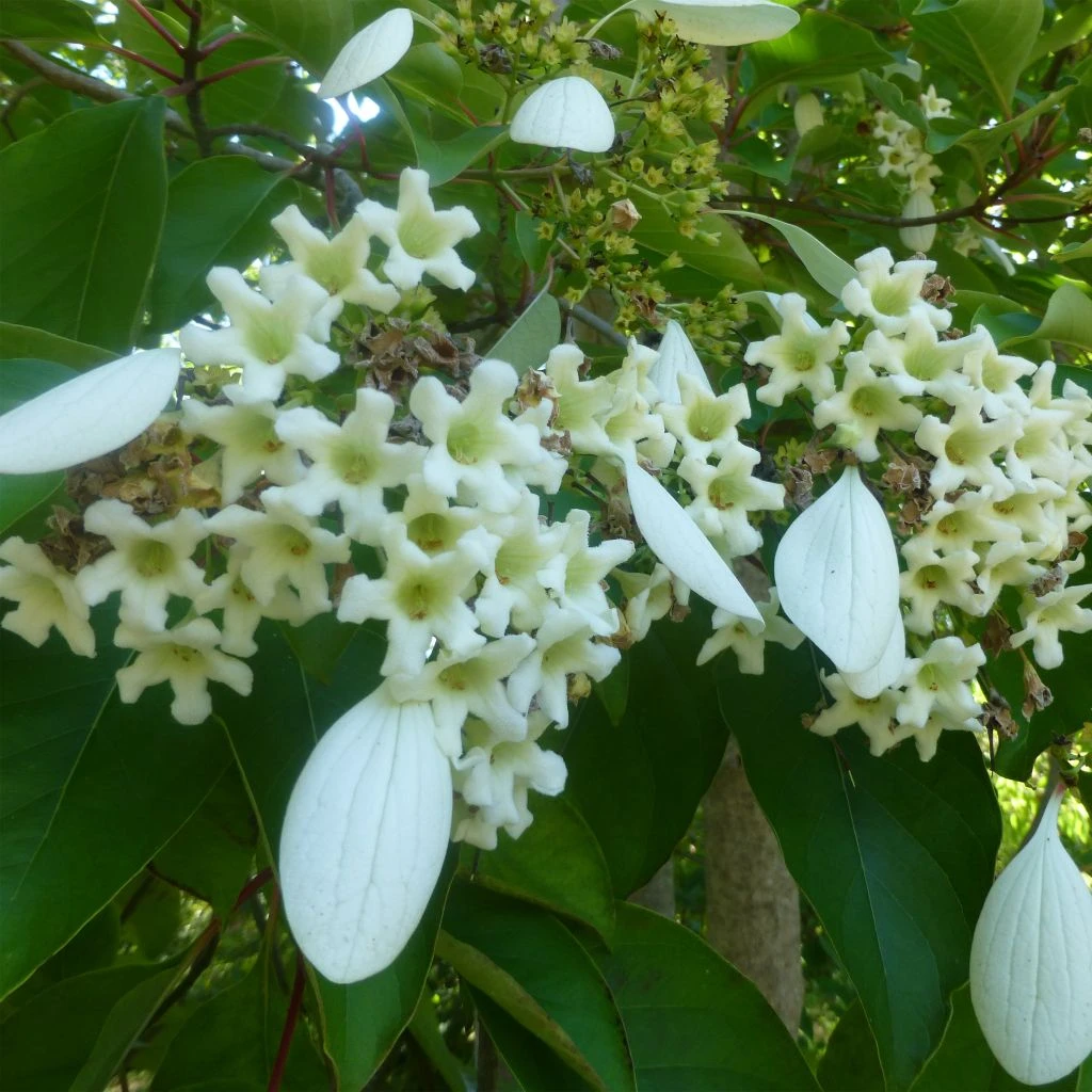 L’Emmenopterys henryi est un arbre excessivement rare et extrĂŞmement recherchĂ©, originaire de l’est de l’Asie, poussant dans les forĂŞts, entre 500 et 1600 m d’altitude. Dans son habitat d’origine, il peut atteindre jusqu’à 45 m de hauteur et vivre plus de mille ans. Appartenant Ă la famille des RubiacĂ©es, et de croissance lente, il forme un arbre au port Ă©talĂ© et Ă©vasĂ©, de taille moyenne Ă grande, atteignant environ 12 m en culture, pour une envergure de 8 m environ. Son Ă©corce exfoliĂ©e est brun grisâtre, puis devient rugueuse et sillonnĂ©e. Il possède un feuillage coriace caduc, composĂ© de larges feuilles ovales lustrĂ©es, de 8 Ă 20 cm de long, vert sombre dessus, plus claires et poilues au revers, dotĂ©es d’un pĂ©tiole rouge. Les jeunes pousses sont d’un beau rouge bronze. De juin Ă aoĂ»t, il se pare de fleurs tubulaires cireuses, blanc crème, très dĂ©coratives, possĂ©dant cinq sĂ©pales Ă©talĂ©s et mesurant 1 Ă 3 cm de diamètre, et apparaissant en hauteur, sur les branches supĂ©rieures de l’arbre. Elles sont rĂ©unies en panicules de 7 Ă 18 cm de long sur 15 Ă 25 cm de large. Certaines de ces fleurs ont l’originalitĂ© de porter une grande bractĂ©e blanche. Cette floraison exhale un puissant parfum où se mĂŞlent le jasmin, l’ylang-ylang et la vanille. Faisant suite Ă ces inflorescences, apparaissent, de juillet Ă septembre, des fruits en forme de capsules cylindriques, de 3 Ă 4 cm de long, contenant de fines graines ailĂ©es. Â